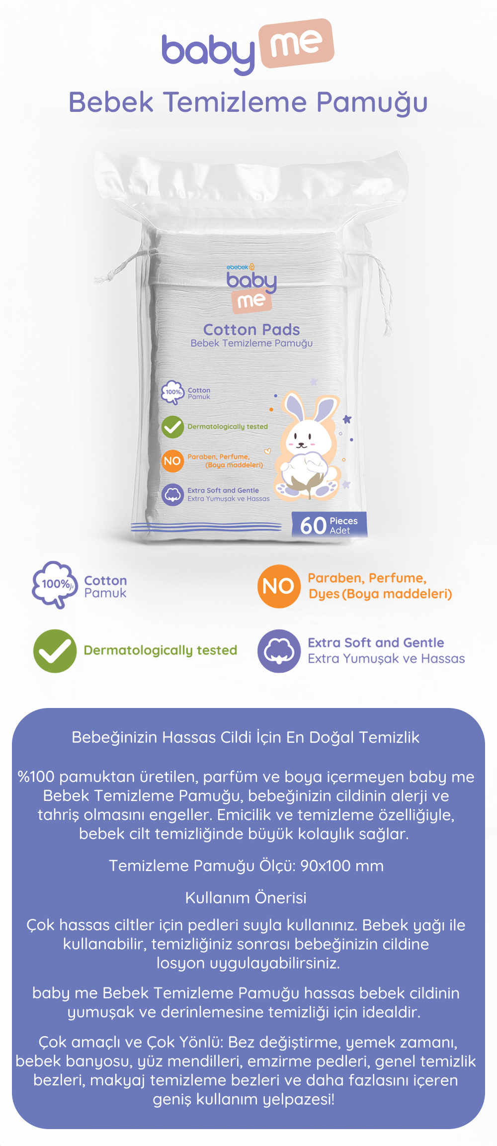 - baby me Bebek Temizleme Pamuğu, Yenidoğanın genel vücut ve alt temizliği için doktor tavsiyeleri ile geliştirilmiş olan %100 saf pamuktan üretilmiştir.