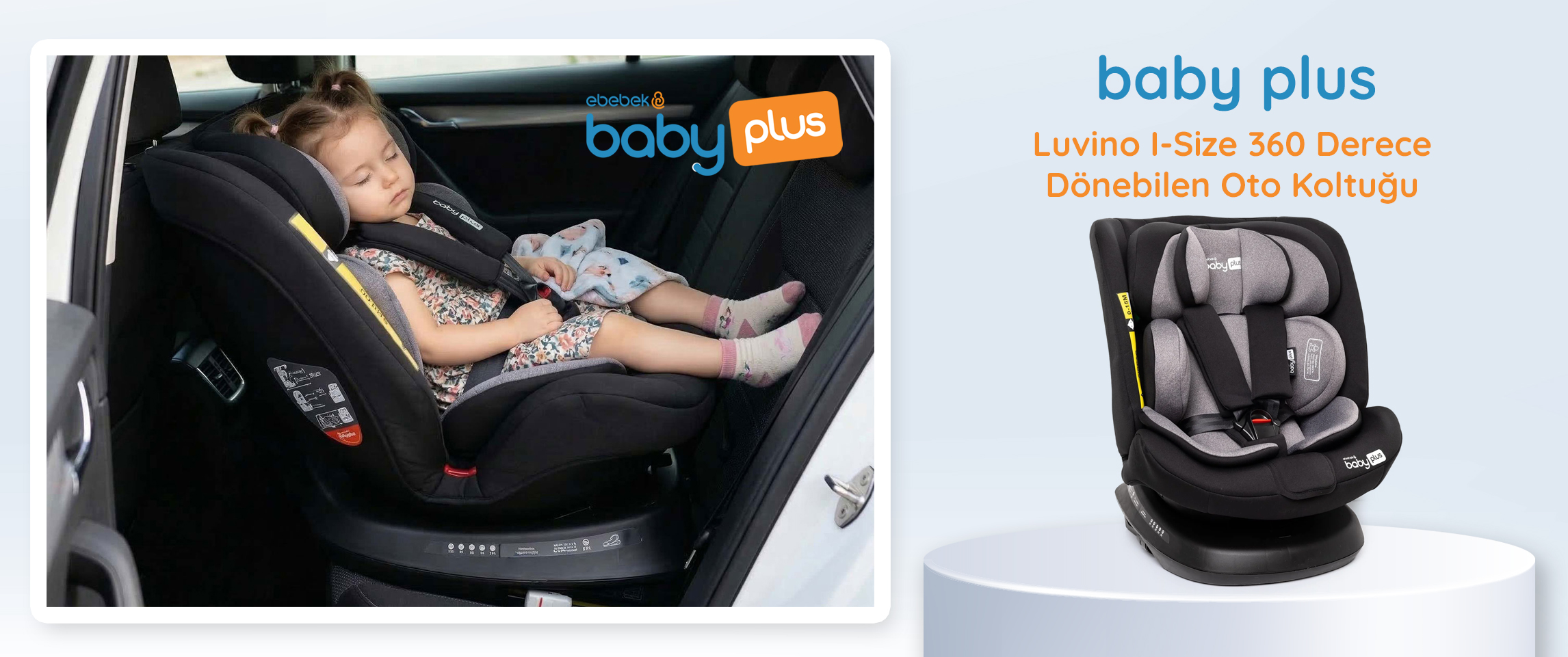 - baby plus Luvino 360° i-Size Oto Koltuğu, doğumdan 12 yaşa (40–150 cm) kadar kullanım aralığı sunan ve 360° dönebilme özelliği ile araca yerleştirme sürecini kolaylaştıran bir güvenlik koltuğudur. ISOFIX bağlantısı, Top Tether sabitleme sistemi ve 5 noktalı emniyet kemeri ile stabil kurulum ve güvenli kullanım hedefler. i-Size (ECE R129) standartlarına uygun üretilmiş yapısı ve çoklu yatış pozisyonları sayesinde farklı yaş dönemlerinde konforlu yolculuk desteği sunar. İleri ve geri yönlü kullanım seçenekleri ile büyüyen çocuklara uyum sağlayacak şekilde tasarlanmıştır.