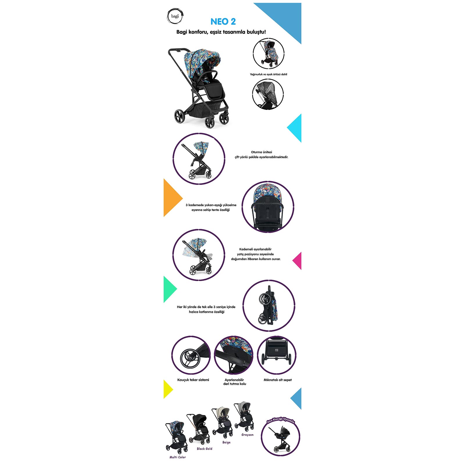 Bagi Neo 2 Bebek Arabası, modern tasarımı, konforlu yapısı ve çift yönlü kullanım özelliğiyle şehir yaşamına mükemmel uyum sağlar. Hafif alüminyum şasesi ve güçlü süspansiyon sistemi sayesinde bebeğinizin konforunu artırırken, ebeveynlere de pratik kullanım sunar. Tek elle kolayca katlanabilen kompakt yapısı sayesinde küçük alanlarda dahi rahatça taşınır ve saklanabilir. Tam yatış pozisyonuna sahip oturma ünitesi, doğumdan itibaren kullanım imkânı sağlar. Geniş tente, ayak örtüsü ve alt sepet gibi detaylarıyla uzun süreli kullanıma uygundur.