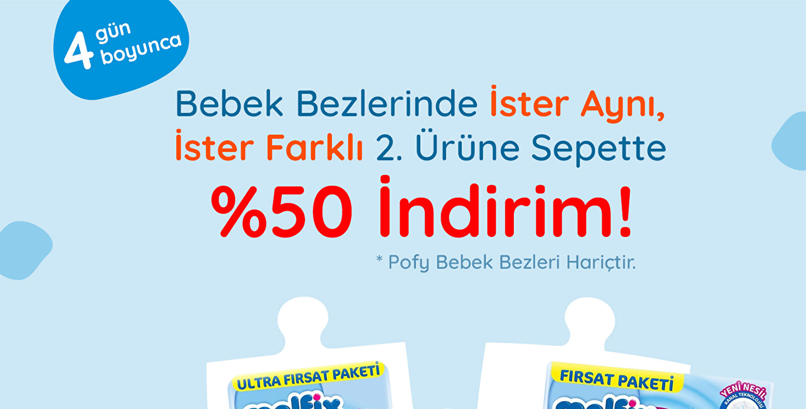 Bebek Bezlerinde İster Aynı İster Farklı 2. Ürüne Sepette %50 İndirim! (Pofy Hariç)