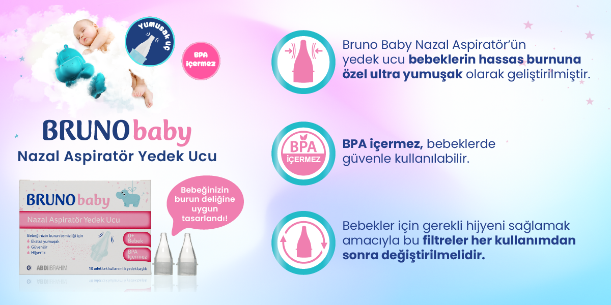 Bruno baby nazal aspiratör yedek ucu, bebeklerin hassas burun temizliği için ekstra yumuşak, hijyenik ve BPA içermeyen yapısıyla güvenli kullanım sağlar.