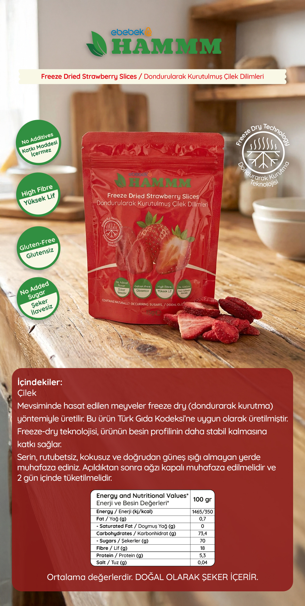 - Hammm Freeze Dried Kurutulmuş Meyve Dilimleri, meyvelerin hasat edildikleri mevsimde freeze dry (dondurarak kurutma) yöntemi ile hazırlanır. Türk Gıda Kodeksi’ne uygun şekilde üretilmiştir.