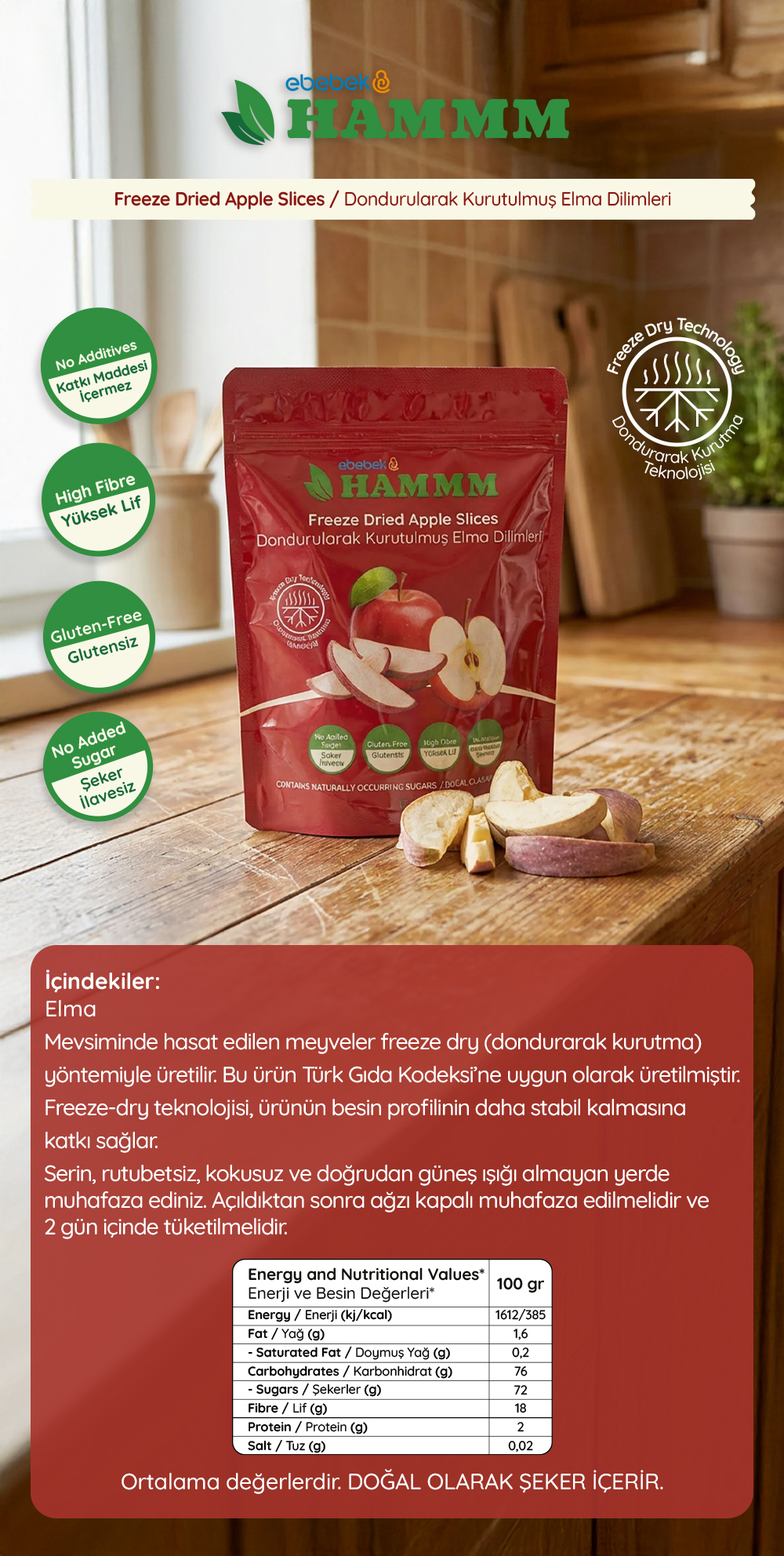- Hammm Freeze Dried Kurutulmuş Meyve Dilimleri, meyvelerin hasat edildikleri mevsimde freeze dry (dondurarak kurutma) yöntemi ile hazırlanır. Türk Gıda Kodeksi’ne uygun şekilde üretilmiştir.