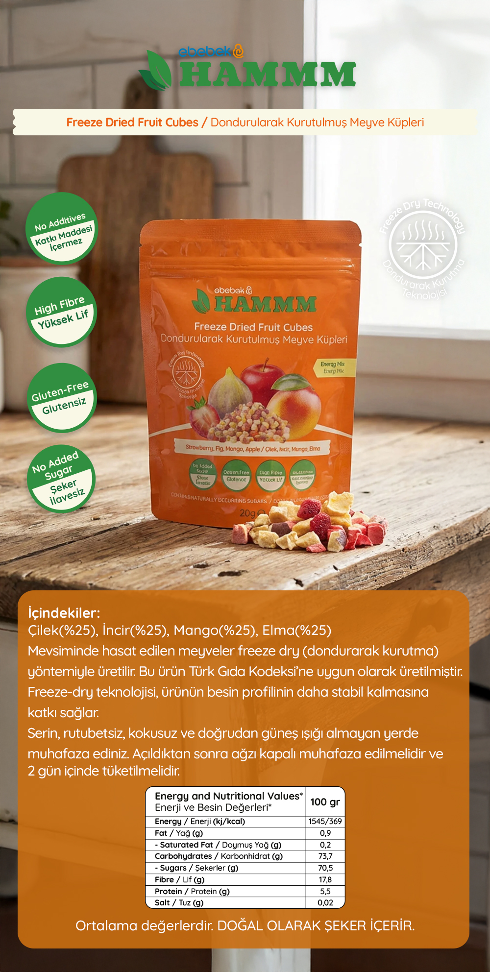 - Freeze Dried Meyve, yalnızca %100 meyve içeriğine sahip olup katkı maddesi eklenmeden Freeze Dry teknolojisi ile dondurularak hazırlanmıştır. İlave şeker, tuz veya yapay tatlandırıcı içermeyen formülü sayesinde doğal meyve tüketimi için pratik bir alternatif sunar. Alerjen içermeyen yapısı ve ambalaj güvenliğini destekleyen materyal özellikleri ile günlük kullanıma uygundur. Ürün, BRC ve FDA sertifikalarına sahiptir.
