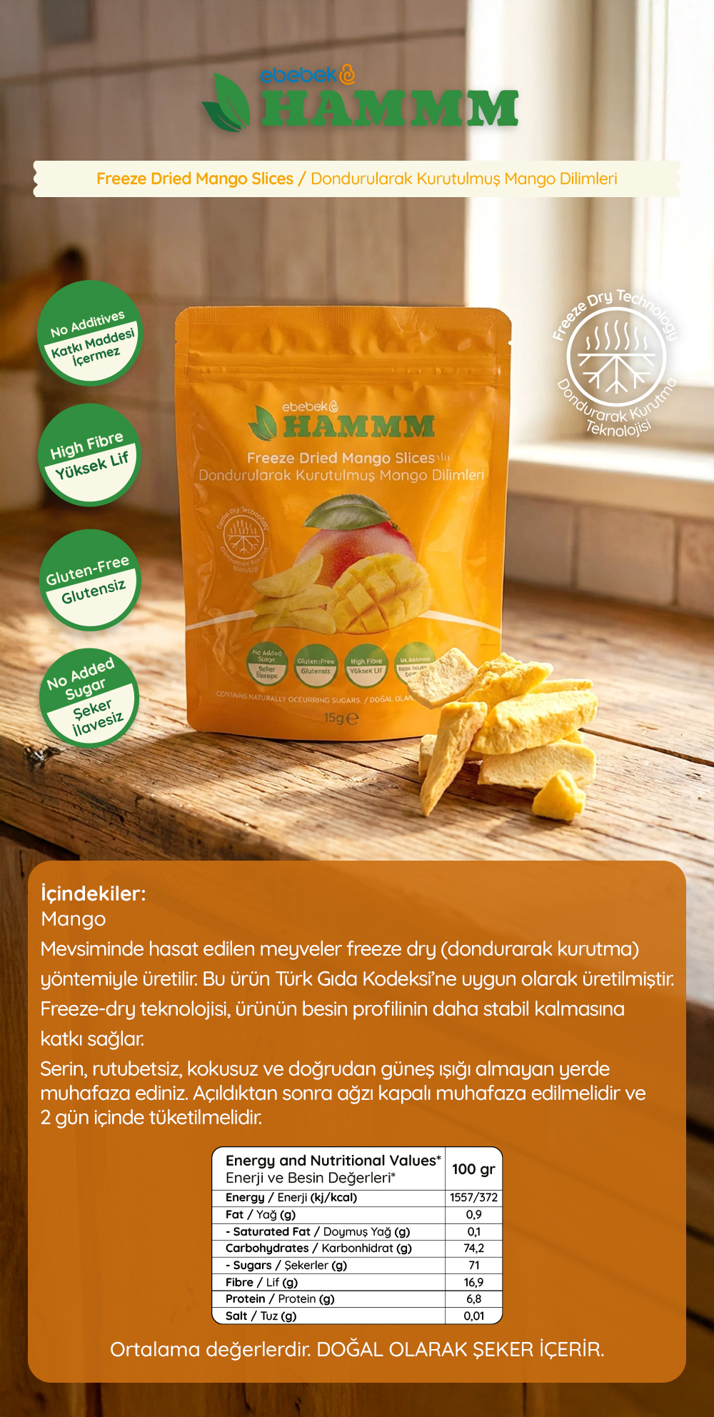 - Hammm Freeze Dried Kurutulmuş Meyve Dilimleri, meyvelerin hasat edildikleri mevsimde freeze dry (dondurarak kurutma) yöntemi ile hazırlanır. Türk Gıda Kodeksi’ne uygun şekilde üretilmiştir.
