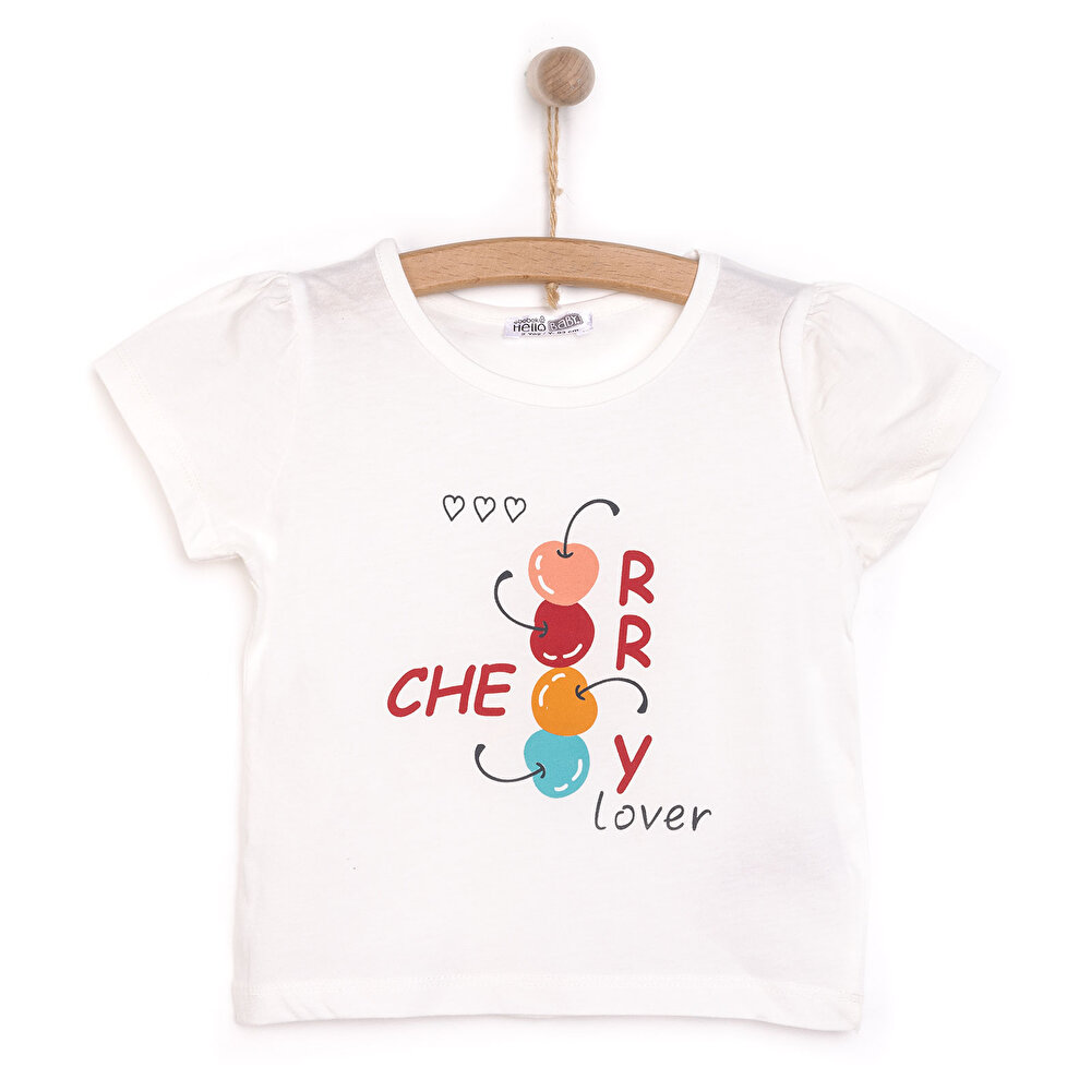 HelloBaby Kız Bebek Basic Tişört Kiraz Desenli Bisiklet Yaka Kısa Kol Ekru