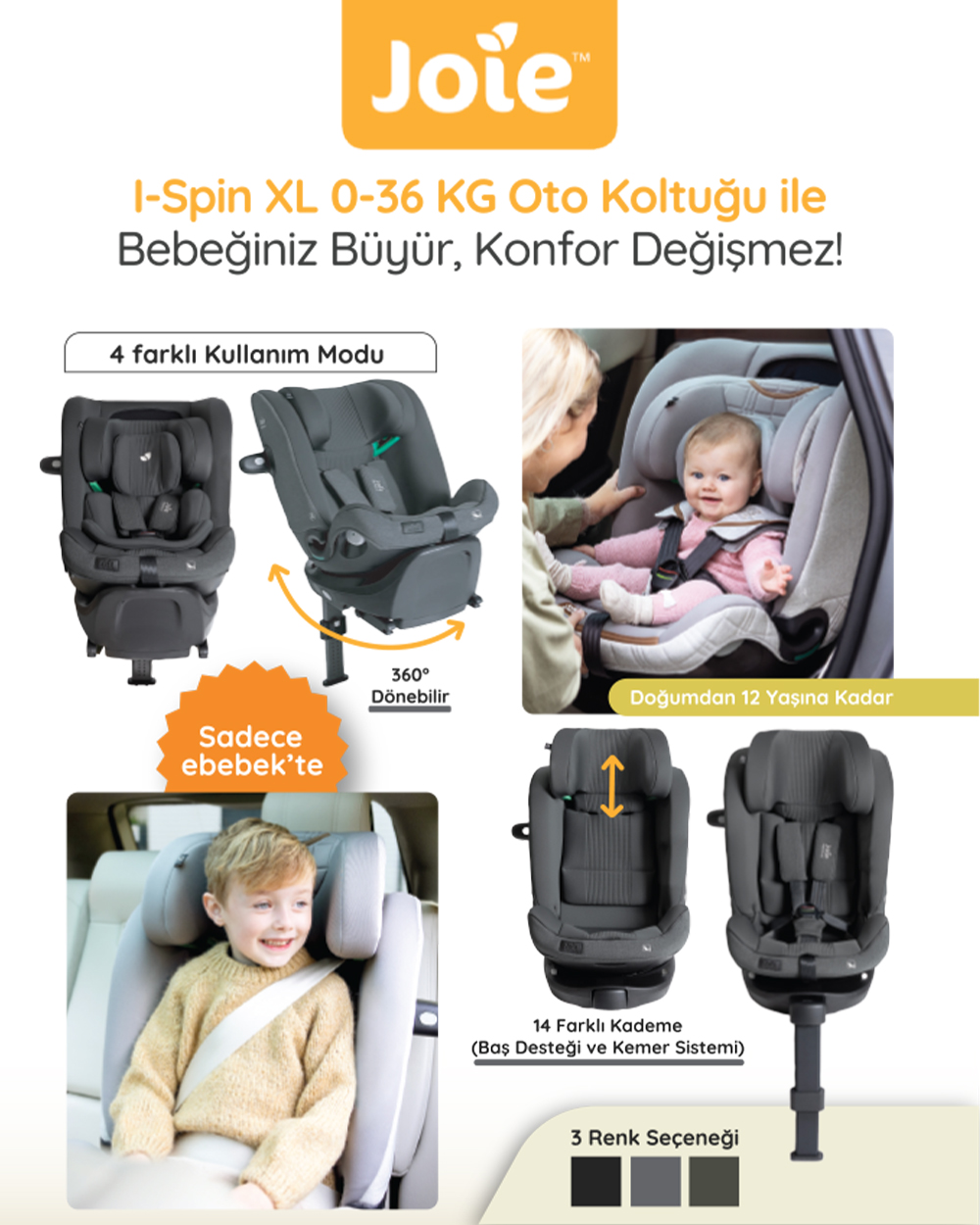 - Bebeğinizin ilk yolculuğundan ergenlik çağına kadar, onunla büyüyen bir oto koltuğu hayal edin. Joie i-Spin XL Tüm Aşamalar Oto Koltuğu, ebeveynliğinizi kolaylaştırmak için titizlikle tasarlandı ve çocuğunuzun her yaşta güvenliğini ve konforunu sağlamak için geliştirilmiş üstün özelliklere sahip.