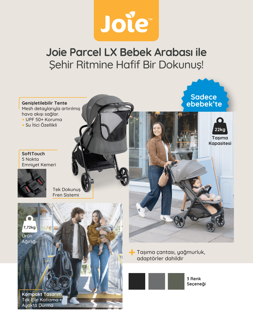 - Joie Parcel LX Bebek Arabası, doğumdan itibaren 22 kg’a kadar kullanım imkânı sunan yapısıyla günlük kullanım ve seyahat ihtiyaçları düşünülerek tasarlanmıştır. Tam yatabilen sırt ayarı, ayarlanabilir ayak dayanağı ve havalandırmalı canopy yapısı sayesinde bebeğin konforunu destekler. SoftTouch 5 nokta emniyet kemeri ve tek dokunuşla devreye giren fren sistemi, güvenli bir sürüş deneyimi sağlamaya yardımcı olur. Hafif yapısı, kompakt şekilde katlanabilmesi ve ayakta durabilen tasarımı ile ebeveynler için pratik bir kullanım sunar. Dahil adaptörleri sayesinde Joie bebek taşıma koltuklarıyla uyumlu çalışarak esnek bir seyahat sistemi oluşturur. Su itici ve UPF 50+ canopy, yağmurluk ve taşıma çantası gibi aksesuarlarıyla farklı hava koşullarına uyum sağlar.