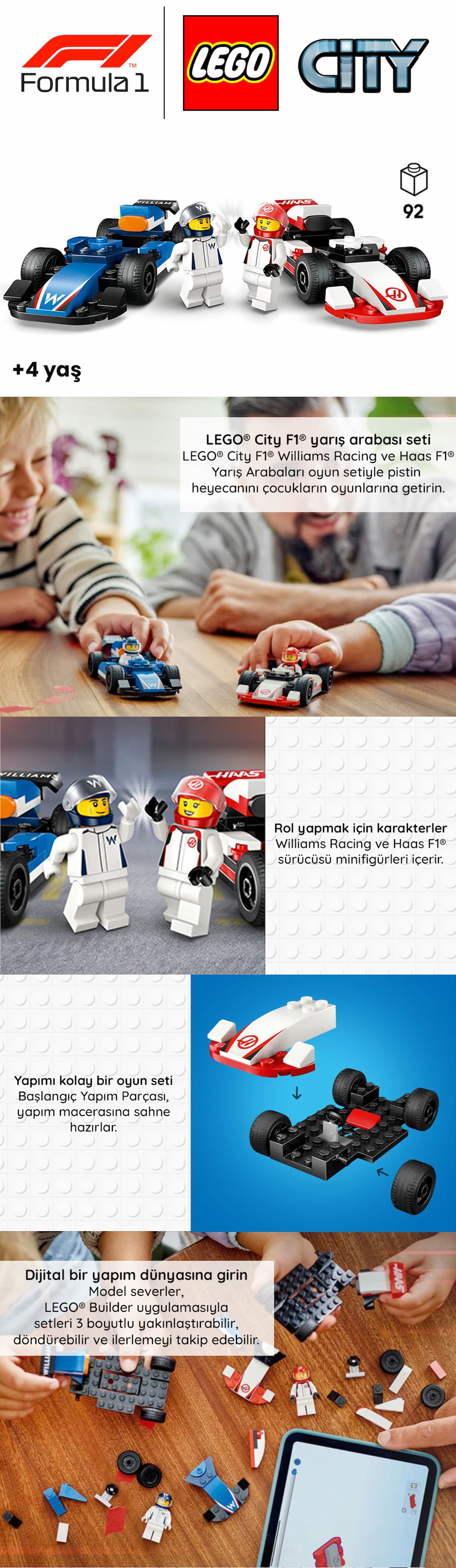 - Williams ve Haas sürücü mini figürlerini ekleyin, yarış eğlencesi başlasın. Çocuklar ve yetişkinler için F1 temalı LEGO yapım setlerinden oluşan dinamik seriyi keşfedin. Bu yapımı kolay F1 oyuncak araba setinde bir LEGO Başlangıç Yapım Parçası, resimli bir rehber ve çocukların modeli inşa ederken her açıdan görmelerini sağlayan yakınlaştırma ve döndürme araçlı dijital bir yapım yardımcısı olan LEGO Builder uygulamasında 3 boyutlu yapım talimatları bulunur.