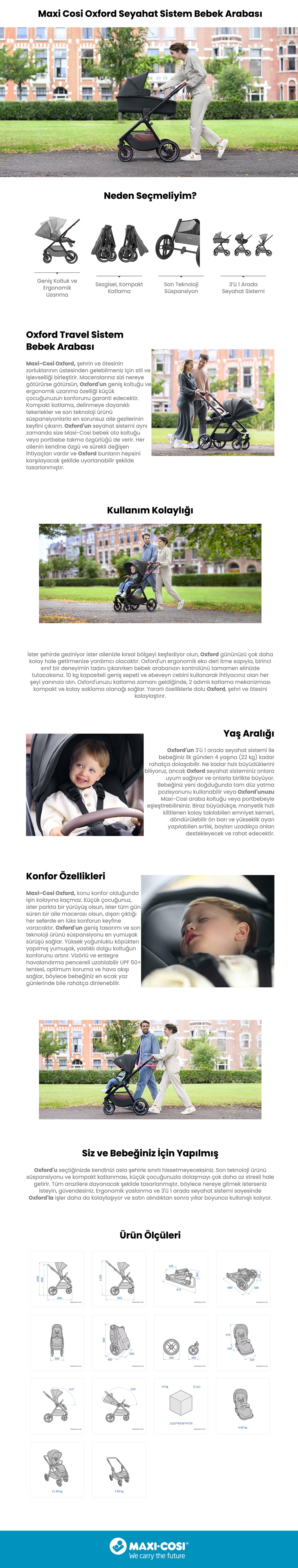 - Travel sistem bebek arabası: Maxi-Cosi Oxford, şehir içi kullanım ve günlük yaşam için tasarlanmış bir seyahat sistemi bebek arabasıdır. Oto koltuğu ve portbebe ile uyumlu yapısı sayesinde farklı kullanım senaryolarına uyum sağlar.