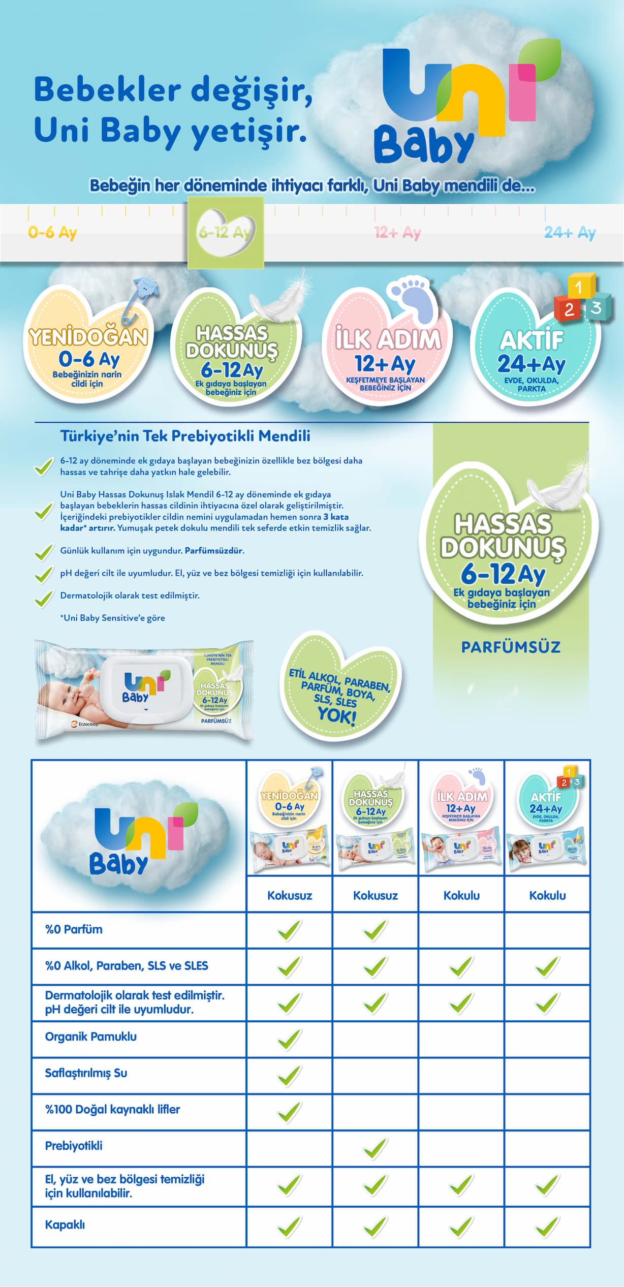 - Uni Baby hassas dokunuş ıslak mendili 6-12 ay döneminde ek gıdaya başlayan bebeklerin hassas cildini ihtiyacına özel olarak geliştirilmiştir.